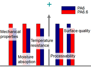 Las diferentes disposiciones de las moléculas hacen que encontremos más beneficios mecánicos en la PA 6.6. Además, PA 6.6 absorbe menos humedad y por lo tanto es inherentemente más estable. Las ventajas de PA 6, se ven especialmente en su fibra de vidrio reforzada, que hacen que tenga un mejor acabado en su superficie, que depende siempre de la solidificación de su masa siendo fundida más lentamente. Además, las temperaturas de procesamiento inferiores de PA 6 reducen el consumo de energía que conduce a menores costes de producción en comparación con PA 6.6. Debido a la mayor absorción de humedad, PA 6 tiene una resistencia al impacto superior que PA 6.6.